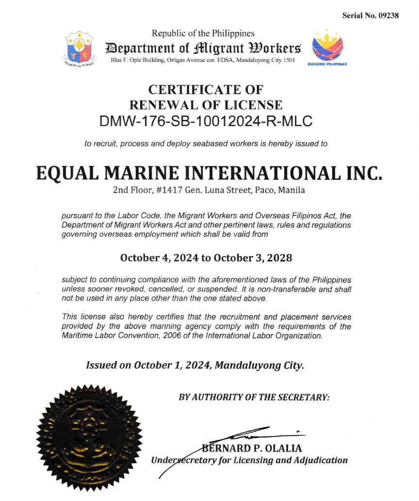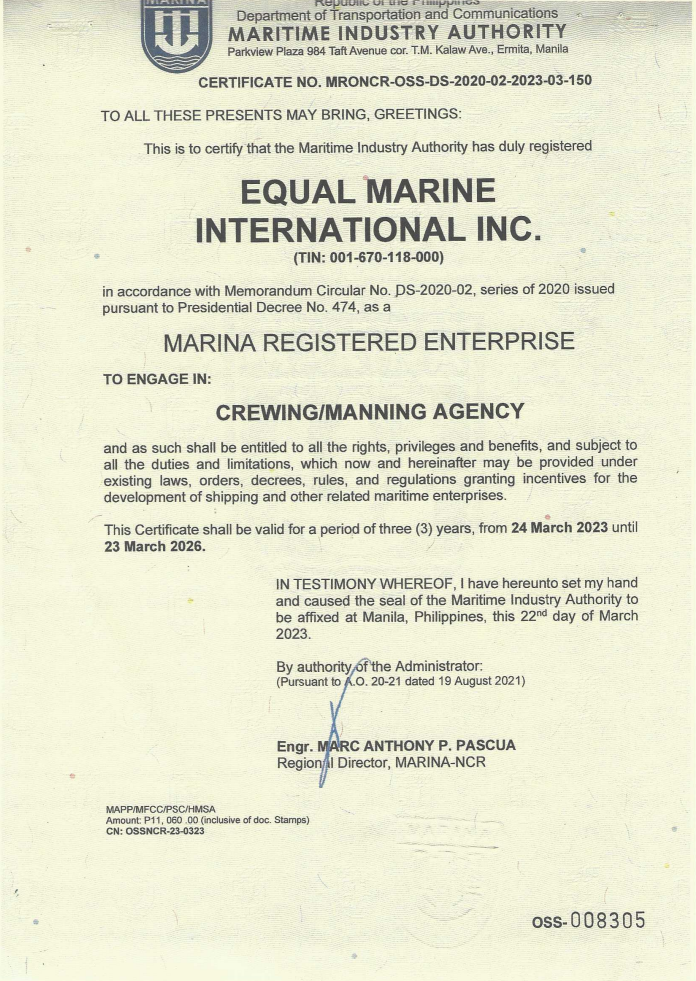 His extensive employment history includes serving as the President of Equal Marine International Inc. since 2011. He also held the position of Assistant Secretary for Maritime Affairs in the Office of the President of the Philippines from 2007 to 2010.